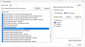 To enable this report for a user in Bp Premier. navigate to Setup > Users > Edit > Setup Reports and tick the checkbox next to Transaction Report – Bulk Bill PIP Audit.